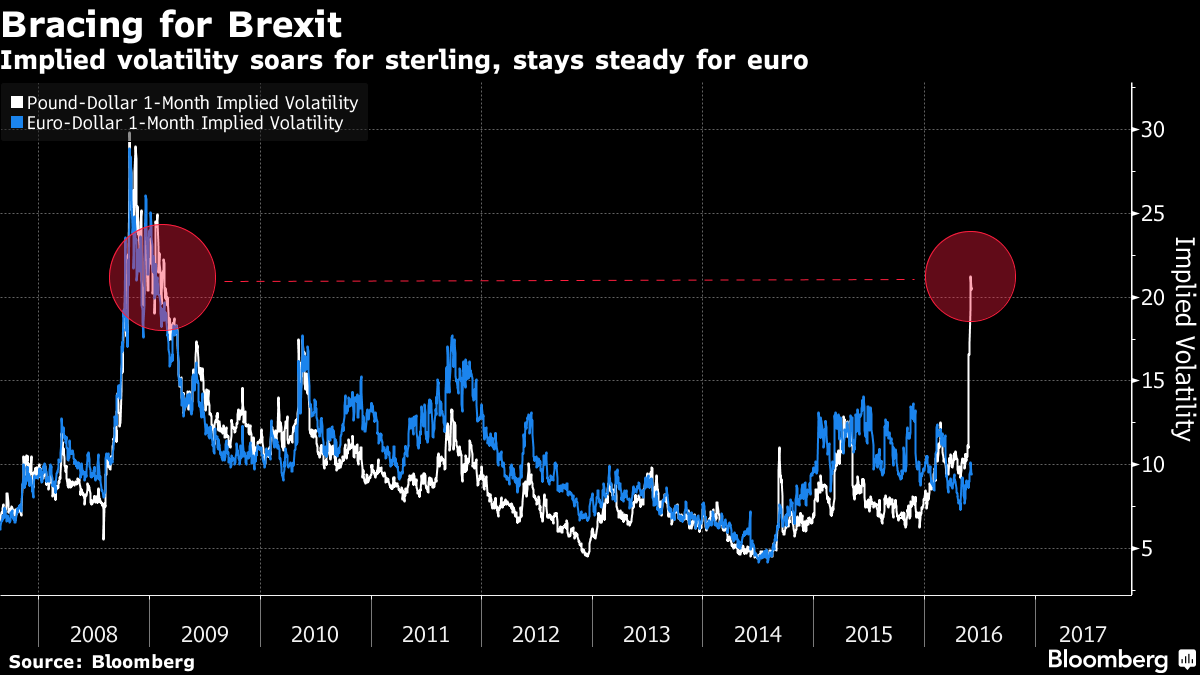 W kwestii oczekiwanej zmienności na rynku walutowym należy spojrzeć na tęże implikowaną na bazie rynku opcji, by odpowiedzieć sobie na pytanie, gdzie oczekiwać większych ruchów na GBPUSD czy EURGBP. Jak widać na wykresie poniżej zdecydowanie bardziej dynamiczne ruchy w ciągu następnych kilku tygodni oczekiwane są na rynku GBPUSD (potężny wzrost oczekiwanej zmienności wywołał ostatnio nieoczekiwany ruch na GBP), co jest dość zrozumiałe, gdyż reakcja na euro jak i na funcie powinna podążać w tożsamym kierunku, choć w przypadku głosu na TAK należałoby spodziewać się większego wzrostu EURGBP. O kwestii oczekiwanej zmienności na GBPUSD pisałem już w lutym, kiedy temat Brexitu coraz śmielej wkraczał na rynkowe salony.