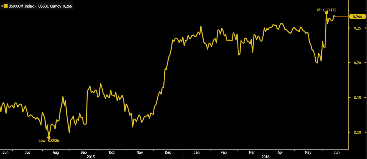 W dzisiejszym wpisie prezentuję jak widmo Brexitu postrzegane jest przez rynek, poprzez różne klasy aktywów, nie tylko te brytyjskie. Po pierwsze warto zauważyć, że w ostatnim czasie rośnie ryzyko finansowe na międzybankowym rynku w USD. Oczywiście po części jest to spowodowane spadkiem oczekiwań co do polityki monetarnej prowadzonej przez FED, z drugiej zaś strony – jak twierdzi Barclays – czynnik ten może być szybko zastąpiony przez wynik referendum na Wyspach.
