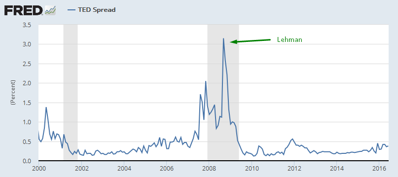 Wracając jeszcze do kwestii wpływu referendum na rynek międzybankowy dla dolara, skąd takie powiązanie? Wynika to z faktu, iż wiele brytyjskich jak i amerykańskich instytucji finansowych pozyskuje w ten sposób (z rynku międzybankowego) kapitał. Na koniec kwietnia bieżącego roku kwota uzyskanej w ten sposób gotówki sięgnęła 650 mld USD, z których tylko 215 mld USD było zabezpieczona poprzez użycie transakcji typu repo (repurchase agreement). Pozostała kwota niezabezpieczonych pożyczek stanowiła aż 38% całkowitych aktywów funduszu rynku pieniężnego. Ryzyko Brexitu podnosi więc obawy, a zarazem koszt pozyskania przez amerykańskie instytucje finansowe środków, co też ukazuje rosnące napięcie i strach przed niewypłacalności banków, będących uczestnikami rynku pieniężnego (dla porównania w okresie kryzysu z 2008 roku inna miara ryzyka w sektorze międzybankowym tzw. TED Spread, również pokazała ogromny wzrost, co też widoczne jest na wykresie poniżej).