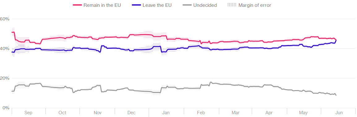 Jak widać powyżej, w ostatnim czasie po raz pierwszy szanse na wyjścia i pozostania w UE zrównały się (powyższe wielkości biorą pod uwagę sumaryczny wynik różnych sondaży). Co jest godne odnotowania to fakt, że maleją liczba  osób niezdecydowanych skłania się do głosowania przeciwko pozostaniu w UE. Skutkuje to tym, że szanse na Brexit implikowane na bazie tychże sondaży wynoszą obecnie aż 39% – najwyższa wartość.