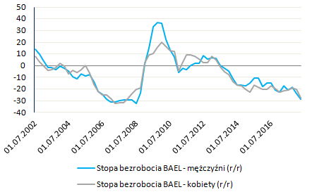 Począwszy od najbardziej aktualnych danych, które poznaliśmy dzisiejszego przedpołudnia przy okazji publikacji biuletynu statystycznego GUS, stopa bezrobocia w sierpniu wyniosła 5,8% względem 5,9% miesiąc wcześniej. Taka wysokość stopy bezrobocia w sierpniu oznacza roczną dynamikę na poziomie -17,1%. Osobiście jakiś czas temu postawiłem tezę, że dynamika spadku stopy bezrobocia osiągnęła swój najwyższy poziom w listopadzie ubiegłego roku (-20,7%). Od tej pory dość płynnie dynamika ta się kurczyła aż do sierpnia, gdzie wynik -17,1% wygląda zachęcająco względem -15,7% w lipcu. W tym miejscu należy wspomnieć o dwóch aspektach. O ile w dalszym ciągu uważam, że zeszłoroczna dynamika spadku bezrobocia nie będzie już poprawiona, o tyle trzeba brać pod uwagę fakt, że podaż pracy jest stale uzupełniana przez imigrantów ze wschodu (w pierwszym półroczu +148 tys. wydanych pozwoleń na pracę). Po drugie, choć dynamika spadku stopy bezrobocia mierzonej przez GUS w ostatnim czasie nieco zwolniła, to dane o bezrobociu według metodologii BAEL nie pokazują podobnych zależności.