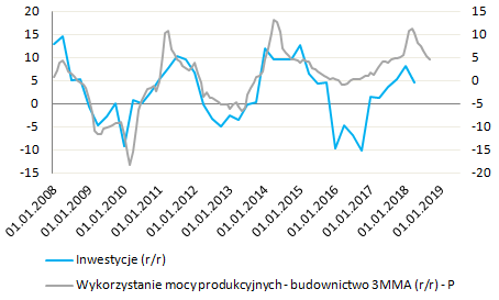 W takich warunkach trudno oczekiwać, że firmy budowlane będą zwiększały nakłady inwestycyjne, co w mojej opinii jest kolejnym sygnałem osiągnięcia maksimum dynamiki jeśli chodzi o poziom inwestycji najprawdopodobniej w trzecim kwartale bieżącego roku. Będąc przy tematyce inwestycji warto odnotować kolejny sygnał sugerujący bliskość ich szczytu, mianowicie zmiany w poziomie wykorzystania mocy wytwórczych w sektorze budowlanym (ale równie dobrze i całym przemyśle). O ile poziom tej systematycznie wzrasta (we wrześniu było to 87,2%), o tyle dynamika tego wzrostu znajduje się w spadkowej trajektorii od marca. To, w połączeniu ze słabnącym trendem jeśli chodzi o liczbę wydanych pozwoleń na budowy, może zniechęcać firmy budowlane do angażowania się w większe projekty inwestycyjne.