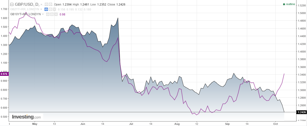 Kurs GBPUSD i rentowności 10-letnich obligacji UK, źródło: Investing.com