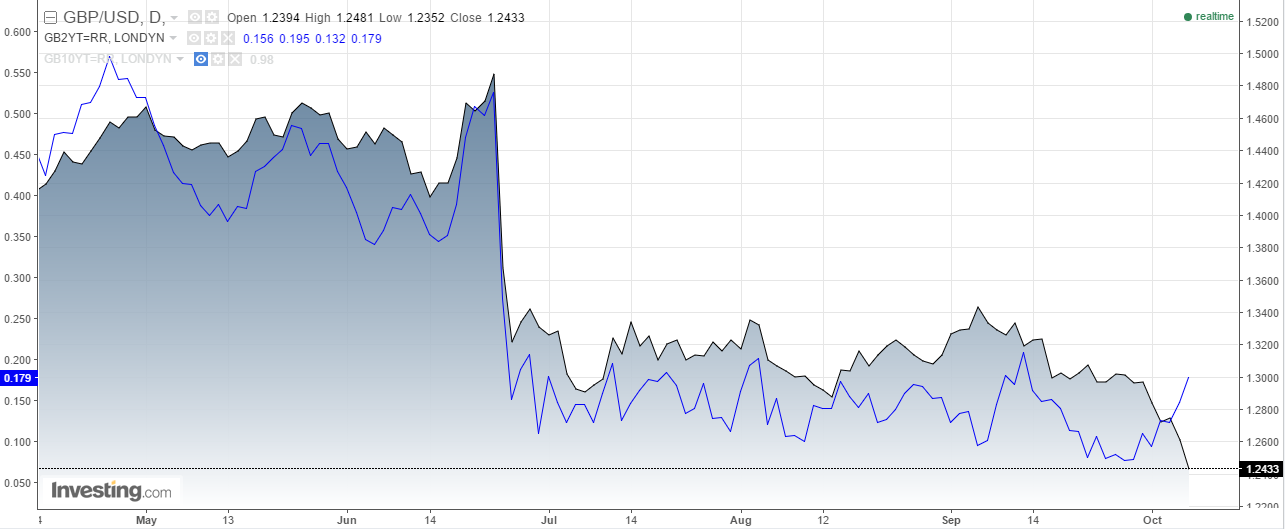 Kurs GBPUSD i rentowności 2-letnich obligacji UK, źródło: Investing.com