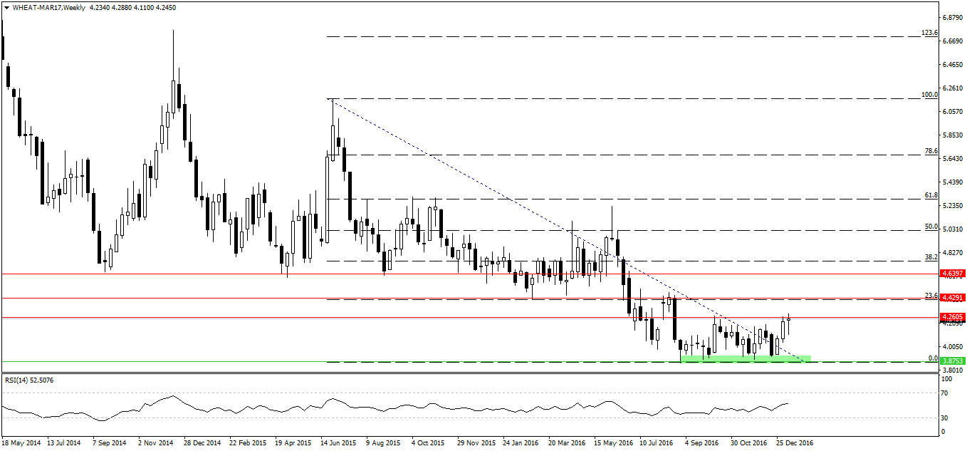 Z analizy wolumenu na towarowej giełdzie w Chicago wynika, że w ostatnich dniach każda mocna świeczka popytowa była wspierana przez znaczący wzrost wolumenu, co zdaje się tłumaczyć wzrostowe nastawienie inwestorów na tamtejszy rynku. Z czysto handlowego punktu widzenia (ujęcie techniczne) obecnie widać (wykres poniżej), iż kontrakt CFD na pszenicę dotarł do ważnego oporu, lecz z szerszego punktu widzenia potencjał do wzrostów jest znaczący.
