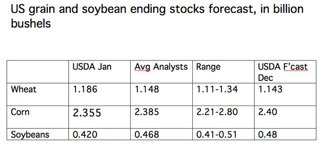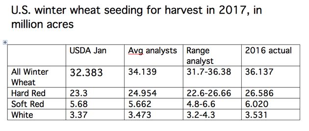 Z drugiej strony wielkości szacowanych zapasów na koniec roku wyniosła więcej niż wskazywała na to grudniowa projekcja. Poziom zapasów pszenicy wyniósł 1186 mln buszli wobec prognozy analityków (średnia) 1148 mln buszli. Jednakże wartość ta mieściła się w zasięgu rozproszenia prognoz wszystkich analityków.