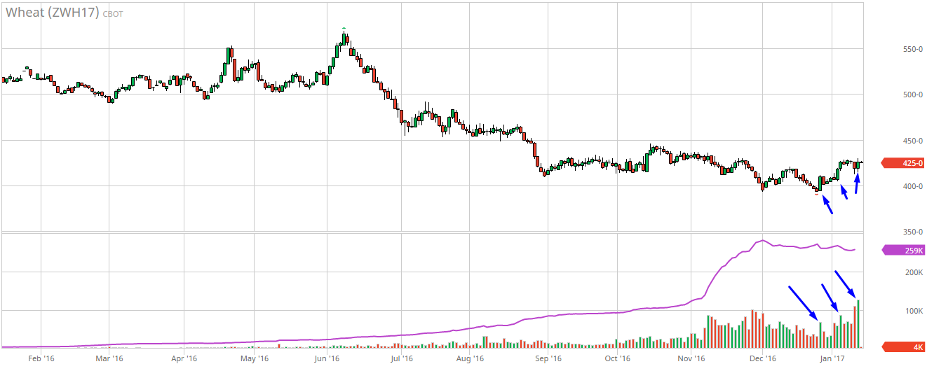 Jak na grafice załączonej powyżej, dane za styczeń pokazały zasiewy na poziomie 32,4 mln akrów przy średniej oczekiwań na poziomie nieco powyżej 34,1 mln. Poniżej mamy wielkości z rozbiciem na poszczególne gatunki pszenicy ozimej. W porównaniu do roku 2016 ilość zasiewów spadła o około 10%. Co więcej, jest to najniższa ilość upraw od 1909! W związku z tym pojawia się szansa na realizację byczego scenariusza. W tym miejscu zachęcam do lektury ostatniego raportu fundamentalnego właśnie dla pszenicy.