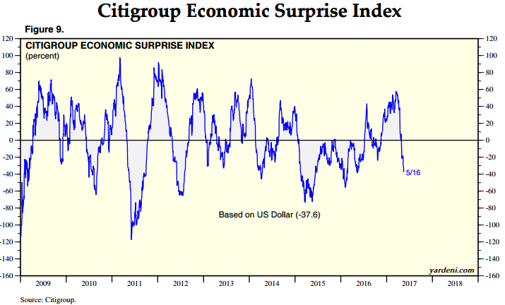 Na ten moment skala 'mijania się’ realnych publikacji z oczekiwaniami widoczna jest w spadkach indeksu zaskoczenia danymi prowadzonego przez analityków Citi. Aktualnie spadliśmy do najniższego poziomu od początku 2016 roku. Daje to do myślenia, zwłaszcza biorąc pod uwagę czerwcową podwyżkę stóp procentowych, której rynek jest już praktycznie pewien.