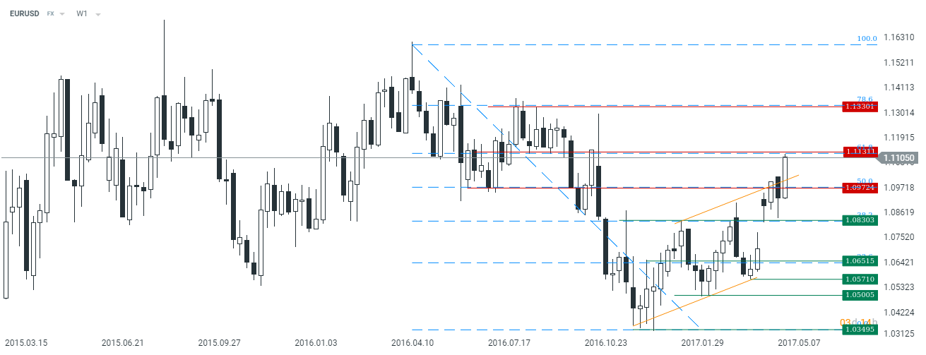 Sytuacja techniczna w długim terminie na EURUSD zaczyna wyglądać coraz lepiej z punktu widzenia strony popytowej. Obecnie cena znajduje się powyżej górnego ograniczenia kanału trendowego, docierając do oporu na 1,1130. Zamknięcie świeczki tygodniowej powyżej tego rejonu będzie silną kartą przetargową dla byków.