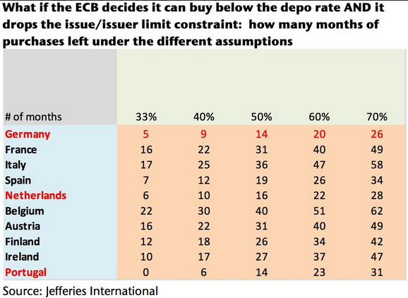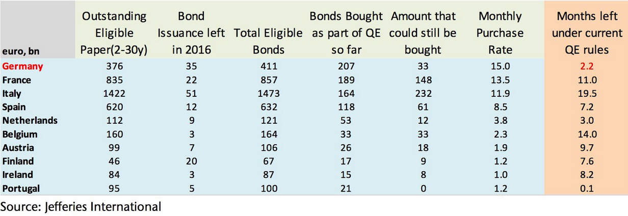Według najnowszych wyliczeń Jefferies International program skupu obligacji powoli dochodzi do ściany, przynajmniej jeśli chodzi o gospodarkę niemiecką. Jest to tym ważniejsze, iż same bundy stanowią największy udział w miesięcznej skali skupu papierów. Według grupy Jefferies jeśli zasady QE nie zmienią się, w ciągu zaledwie nieco ponad dwóch miesięcy EBC nie będzie miało żadnych papierów niemieckich nadających się do zakupu. Kiepsko sytuacja wygląda również w Holandii czy Portugalii, niemniej kraje te nie stanowią dużego udziału w całym programie.