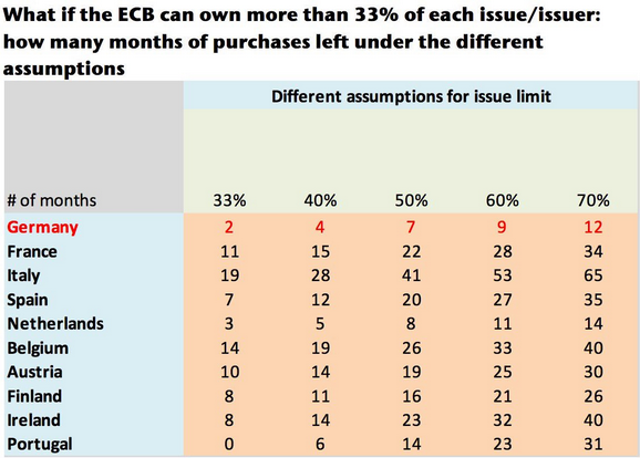 Powyższa tabela przedstawia różne scenariusze ilości skupowanych obligacji przez EBC od danego emitenta. Obecnie odsetek ten wynosi maksymalnie 33%. Jeśli poziom ten zwiększyłby się do 50% wówczas EBC według tych wyliczeń mógłby prowadzić QE jeszcze przez 14 miesięcy, później napotkałby kolejną „ścianę” w postaci niedoboru obligacji.
