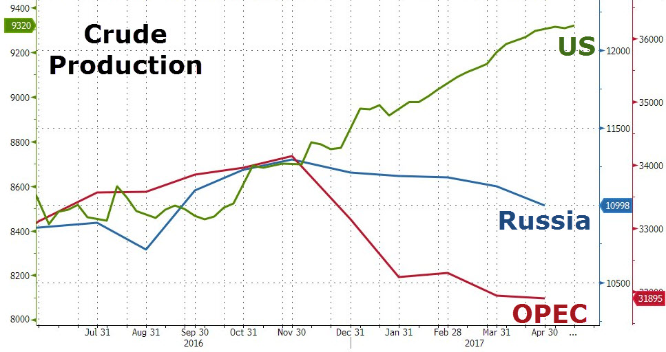 Produkcja ropy w USA, Rosji oraz OPEC, źródło: zerohedge, Bloomberg