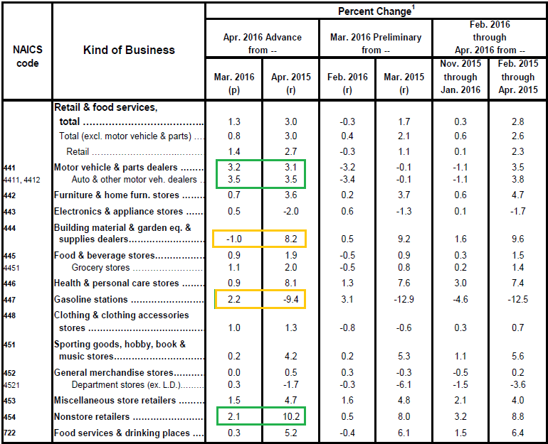 Jednakże kwietniowy odczyt sprzedaży detalicznej rozwiał te obawy, przynajmniej patrząc na tzw. „headline„, czyli wartość główną tejże figury, która wzrosła w ujęciu miesięcznym 1,3%. Jeszcze bardziej imponujący wzrost odnotowano w ujęciu rocznym, gdzie sprzedaż podniosła się aż o 3%. Co jednak było głównym sterownikiem takiego wyniku?