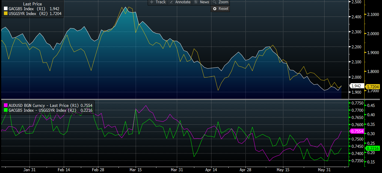 Niemniej jeśli porównamy sobie jak wygląda sytuacja na rynku średnioterminowych obligacji zauważymy, że ostatni rajd na Aussie’im nie jest do końca potwierdzany przez ruch na rynku długu. Obecnie spread rentowności 5-letnich papierów obydwu państw pokazuje na fair value w rejonie 0.7450 i czyli około 100 pipsów od obecnego spota.