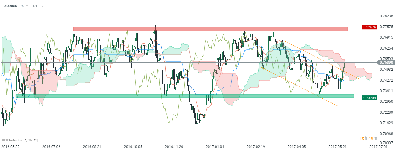 Od strony technicznej wydaje się, że obecnie byki mogą dążyć do przełamania oporu wynikającego z chmury Ichimoku (wczoraj zostało już przełamane górne ograniczenie kanału trendowego). Tym samym otwiera się przestrzeń do wzrostów w kierunku strefy podażowej na 0,7760. W średnim okresie jednak perspektywy dla AUD wciąż nie wyglądają obiecująco, stąd dojście do wspomnianego wcześniej oporu może być wykorzystywane do zawierania pozycji krótkich.