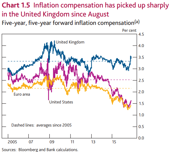 Istnieją ograniczenia, do których MPC może tolerować inflację powyżej celu 2%. Z powodu znacznie wyższej oczekiwanej inflacji prawdopodobieństwo kolejnej obniżki stóp procentowych „wygasło”. Obecnie BoE dostrzega najwyższe okresu (trzy) inflacji jakie kiedykolwiek przewidywał.