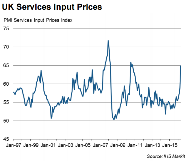 W tym miejscu warto jeszcze odnieść się do dzisiejszego odczytu usługowego indeksu PMI z UK, który oczywiście okazał się lepszy od oczekiwań (podobnie jak wartość dla przemysłu z poniedziałku). Niemniej uwagę przykuwa zwłaszcza jeden subindeks – mowa o wskaźniku mierzącym dynamikę cen dla producenta. Jak widać na wykresie poniżej zanotowaliśmy potężny skok. Dlaczego BoE może się tym przejmować?