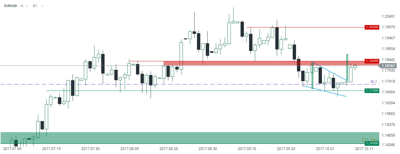 W następstwie wypowiedzi lidera Katalonii notowania euro wyraźniej odbiły, niemniej jednak wcześniej były już one napędzane szeroką wyprzedażą USD. Ta z kolei miała podłoże w polityce i związana była z kruchą pozycją prezydenta Trumpa w kwestii planowanej od dłuższego czasu reformy podatkowej, reformy która zwiększyłaby bieżące wyceny spółek giełdowych na Wall Street będąc paliwem do potencjalnych, dalszych wzrostów. Przechodząc do szczegółów, sojusznicy prezydenta Donalda Trumpa wyrazili wczoraj obawy odnośnie do tego, iż spór głowy państwa z republikańskim senatorem Bobem Corkerem stwarza poważne schody dla implementacji znaczących zmian podatkowych.