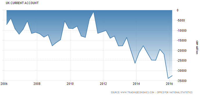 Dlaczego dane są tak ważne? Potężna deprecjacja funta, jaką widzimy od czerwca powinna przyczynić się bowiem do znaczącego zawężania się deficytu z racji ograniczenia importu i zwiększenia eksportu (ceny importowe rosną, zaś eksportowe mocno spadają wraz z deprecjacją waluty). Dzieje się tak, gdyż bilans handlowy jest składową rachunku obrotów bieżących, który z kolei stanowi część najszerszej miary jaką jest bilans płatniczy państwa.
