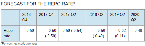 Negatywnie na notowania szwedzkiej korony wpłynęła również rewizja prognozowanej ścieżki stóp procentowych. W ujęciu rocznym (średnia stopa w danym roku) Riksbank zrewidował w dół prognozy stopy repo dla przyszłego i 2019 roku. W komunikacie bank wskazuje jasno, że oczekiwany okres pierwszej podwyżki został przesunięty o kwartał w przód, do połowy 2018 roku.