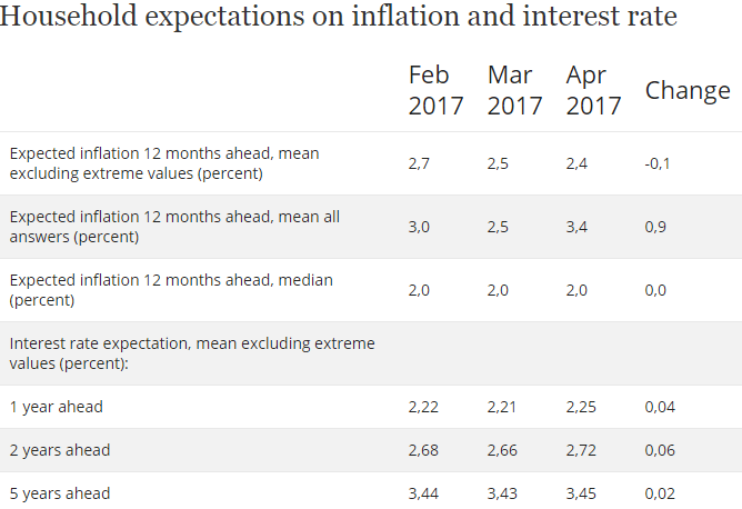Oczekiwania (ankietowe) gospodarstw domowych w kwestii inflacji i stóp procentowych, źródło: konj.se