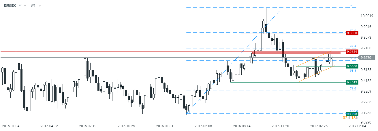 W przypadku EURSEK spadki również nie powinny zawitać, przynajmniej o ile EBC nie zmieni mocno poglądu na gołębi. Według mnie para w kolejnych tygodniach może przełamać poziom 9,68 i górne ograniczenie kanału trendowego. Presja na zmiany w forward guidance EBC narasta, i być może już dzisiaj, bądź w czerwcu, Draghi zasygnalizuje możliwość wychodzenia QE i zakończenia umieszczania w komunikacie stwierdzeń o możliwych kolejnych cięciach stóp.