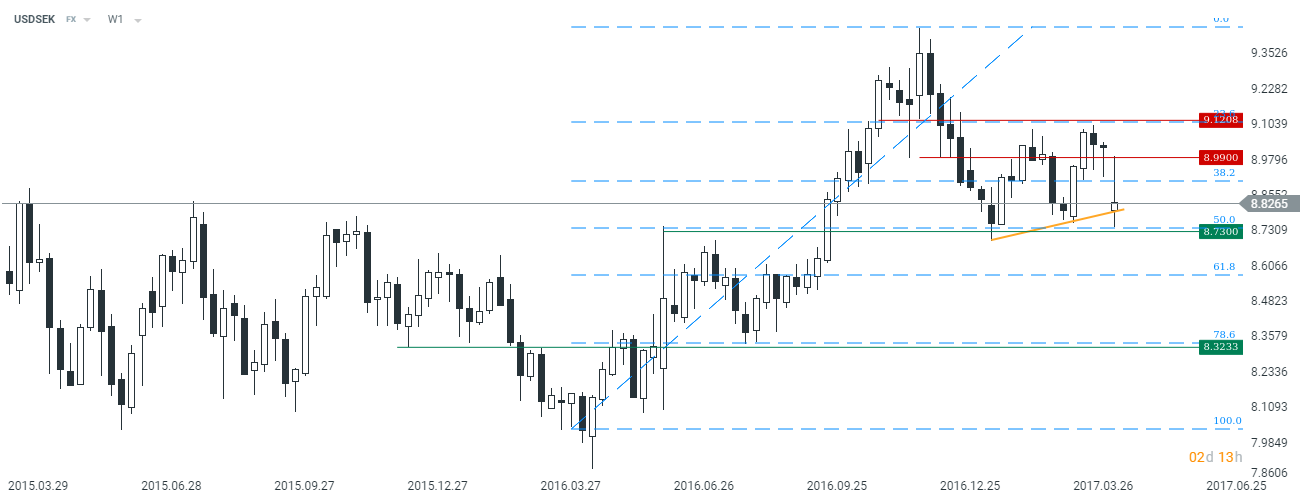 Jeśli chodzi o długoterminowy pogląd na USDSEK to wydaje się, że para może powrócić w kolejnych tygodniach w kierunku 8,99 i następnie 9,12. Znacząca dywergencja w rynkowych stopach procentowych i brak oczekiwanych zmian w najbliższych miesiącach w polityce monetarnej Riksbanku powinny działać na niekorzyść SEK. Dopiero trwałe przełamanie 8,73 zmieniło ten pogląd, niemniej nie sądzę, że będzie to możliwe (na interwale tygodniowym) bez zmiany retoryki szwedzkiego banku centralnego.