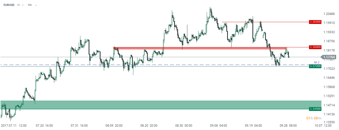 O ile sytuacja wygląda na skomplikowaną z politycznego punktu widzenia, to patrząc od strony rynków finansowych wydarzenie to powinno mieć raczej ograniczony wpływ w długim okresie. Notowania EURUSD spadły około 30 pipsów na otwarciu nowego tygodnia, niemniej jednak wcześniej przetestowaliśmy ważną strefę podażową w rejonie 1,1840. Tym samym można zakładać, że cena będzie zmierzała w kierunku przełamania 1,1720. Taki ruch otworzyłby możliwość do spadków w rejon kluczowej strefy popytowej na 1,1450, o którym pisałem przy okazji omawiania wyborów parlamentarnych w Niemczech. Jednocześnie sądzę, że ewentualne spadku na indeksie hiszpańskiej giełdy o poranku będą raczej okazją do zajmowania pozycji długich, tym bardziej, że IBEX jest mocno niedowartościowany względem chociażby niemieckiego indeksu.