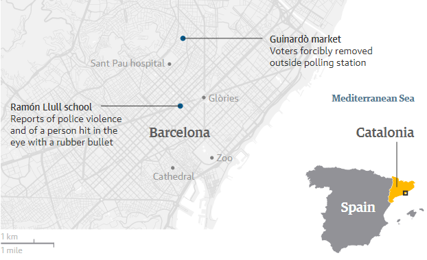 Cała niedziela wyborcza okazała się niezwykle turbulentna oraz pełna przemocy. Według danych lokalnego rządu w Katalonii, w starciach z policiją ucierpiały co najmniej 844 osoby oraz 33 funkcjonariuszy policji. Sam lider regionu Carles Puigdemont wypowiedział się przeciwko przemocy i dodał, że podczas referendum Katalończycy zyskali prawo do utworzenia niezależnego stanu w formie republiki. Zasugerował również, że w ciągu kilku dni wyniki wyborów zostaną przesłane do katalońskiego parlamentu. Oficjalne stanowisko rządu w Madrycie jest takie, iż referendum jest nieważne, gdyż nie odbyło się na terenie całego kraju.