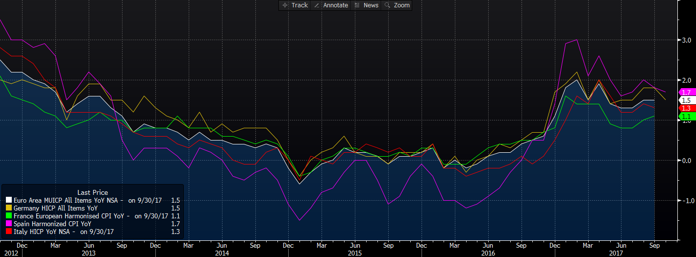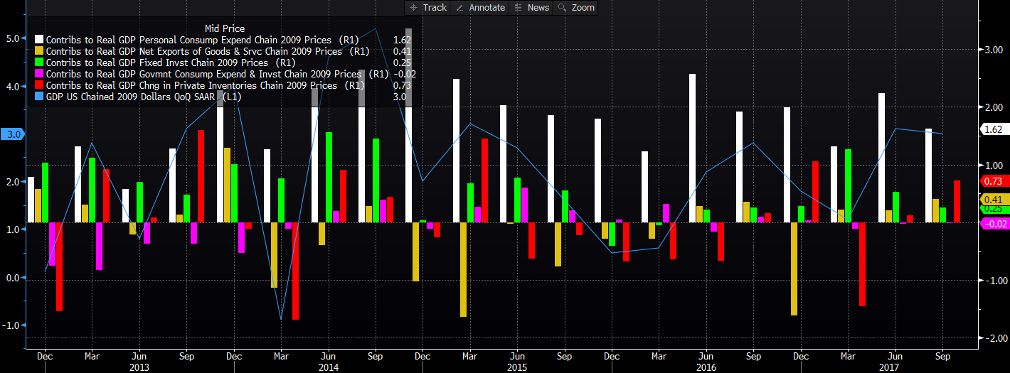 Od tego czasu poznaliśmy dwa kluczowe raporty, były to dane na temat wzrostu gospodarczego w Stanach Zjednoczonych oraz wstępny odczyt inflacyjny z Niemiec, największej europejskiej gospodarki. Dzisiejszą analizę zacznijmy od figur zza oceanu, które okazały się sporo lepsze od oczekiwań, wspierając tym samym notowania amerykańskiego dolara. Mianowicie, wzrost PKB w trzecim kwartale w USA (pierwszy odczyt) wyniósł aż 3% k/k w ujęciu zannualizowanym, co było wartością znacznie przewyższającą konsensus na poziomie 2,5% k/k. Dane te są o tyle dobre, gdyż przeczą obiegowej opinii, iż dwa huragany (Harvey oraz Irma) jakie nawiedziły kraj w trzecim kwartale, wywarły znaczący, negatywny wpływ na aktywność gospodarczą.