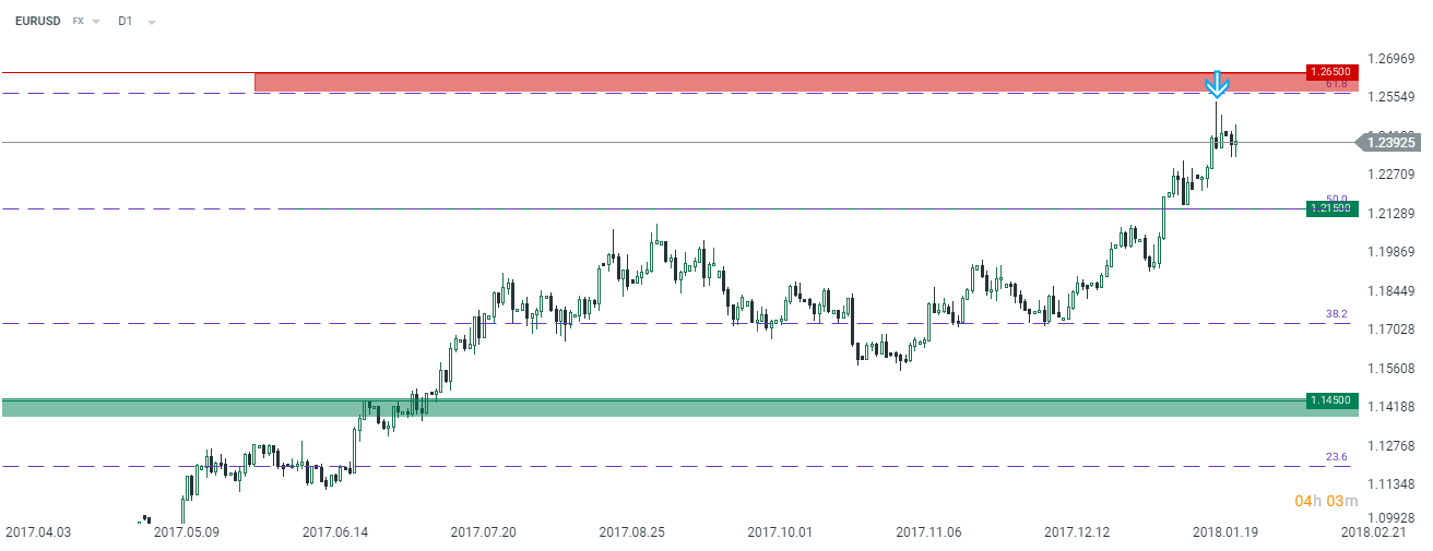 Technicznie na wykresie dziennym głównej pary walutowej wyrysowane zostały dwie świece ze względnie długimi, górnymi cieniami, które mogą sugerować możliwą korektę, choć wprawdzie nie pojawiły się one w obszarze strefy podażowej. Niemniej jednak, dopóki poziom oporu na 1,2650 nie zostanie przełamany, dopóty wciąż istnieje potencjał do cofnięcia w okolicę 1,2150. Aczkolwiek, patrząc na zachowanie się EURUSD od początku tygodnia można zauważyć jak płytkie są korekty wskazując, że kupujących euro jest wciąż pod dostatkiem, mimo coraz wyższej ceny (w długim okresie dolar wciąż pozostaje przewartościowany).