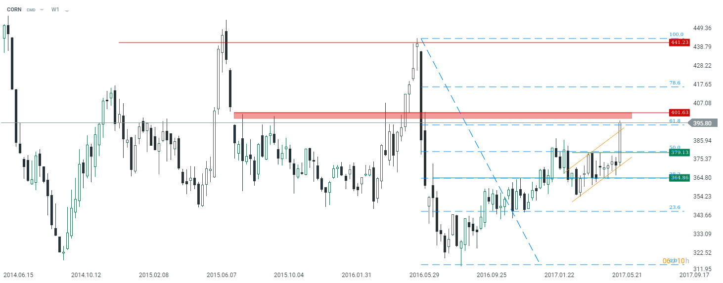 Prognoza zapasów kukurydzy w USA na przyszły sezon nie uległa zmianie. Z kolei projekcje dla pszenicy oraz soi zostały zrewidowane w górę, dla pszenicy powyżej, a dla soi poniżej oczekiwań. Lekko wzrosty również szacowane poziomy zapasów soi i pszenicy w bieżącym sezonie. Z drugiej strony prognoza amerykańskiej produkcji wszystkich rodzajów pszenicy została nieznacznie podniesiona. Prognoza produkcji dla kukurydzy z kolei nie została zmieniona, a zatem wciąż USDA spodziewa się nadwyżki popytu nad podażą. Na koniec warto dodać, że mamy minimalne zagrożenia dla odbicia ceny kukurydzy, które jednak nie powinny odgrywać poważniejszej roli.