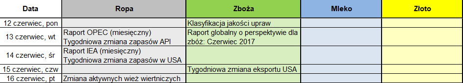 Miniony tydzień na rynkach finansowych został zdominowany głównie przez trzy wydarzenia jakimi były posiedzenie EBC, zeznanie byłego szefa FBI Jamesa Comey’a przed Wywiadowczą Komisją Senacką oraz wybory parlamentarne w Wielkiej Brytanii. Wszystkie miały miejsce we czwartek, stąd i ten dzień dostał przydomek super czwartku na rynkach globalnych. Niemniej z punktu widzenia rynku surowcowego najważniejsze okazały się dwa punkty: środowy raport DoE o zapasach ropy oraz piątkowa publikacja Departamentu Rolnictwa USA (USDA).