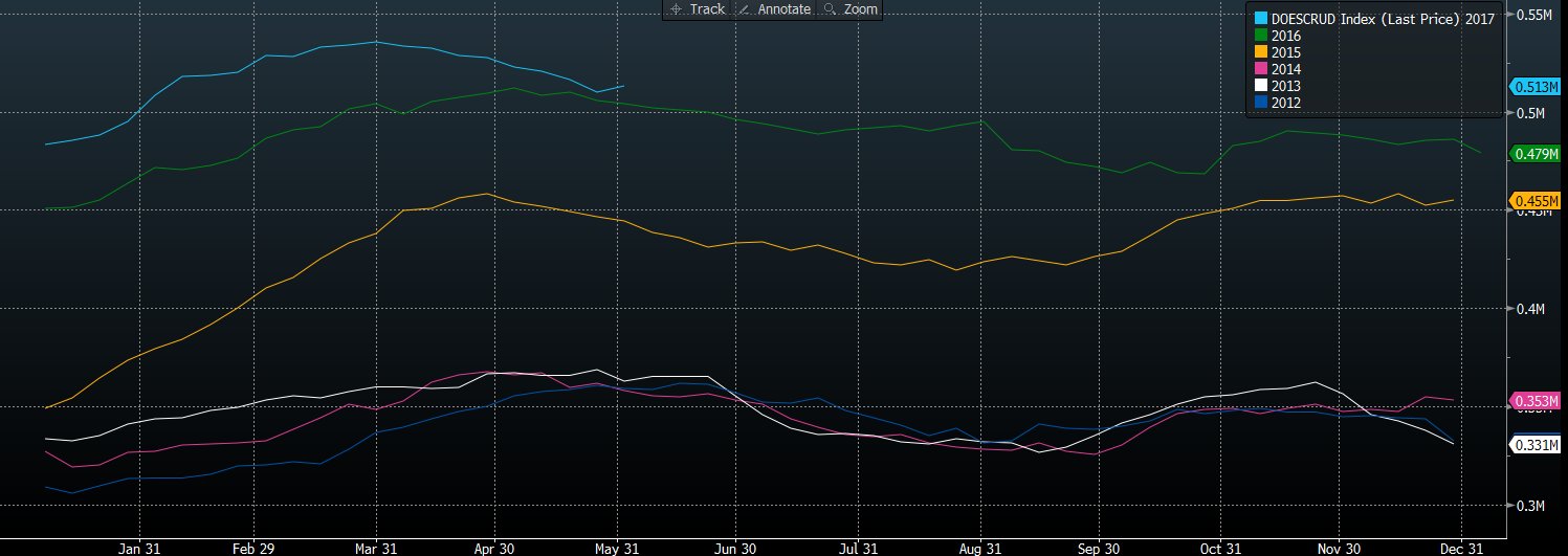 Jakby tego było mało znacząco spadł popyt na benzynę, co w zasadzie nie powinno mieć miejsce w tym okresie, biorąc pod uwagę czynniki sezonowe. Jednakże na ten moment popyt wciąż znajduje się powyżej 5-letniej średniej. Na koniec kwestii sezonowości należy również zwrócić uwagę, że poprzedni tydzień przyniósł pewien zwrot na wykresie odnośnie do sezonowej zmiany zapasów ropy w USA.