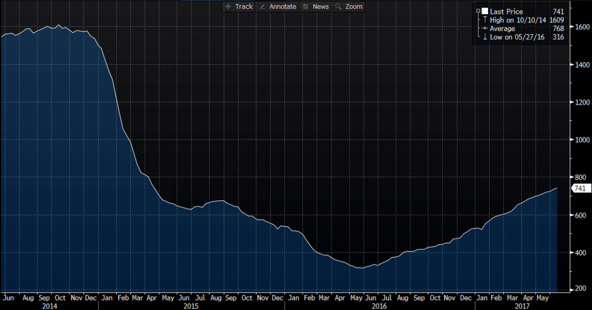 Więcej na temat samego raportu DoE pisałem w specjalnie poświęconej temu analizie. Niemniej warto podkreślić, że jednocześnie wraz ze wzrostem zapasów ropy marginalnie spadło tempo produkcji. Nie jest to jednak póki co żaden znak, który mógłby dawać nadzieję na odwrót w tej kwestii za oceanem tym bardziej, że piątkowe dane pokazały, iż liczba aktywnych wież wiertniczych w USA wzrosła 21-szy raz z rzędu, tym razem o 8 sztuk do 741. Patrząc na poniższy wykres widać, że trend jest póki co niezagrożony.