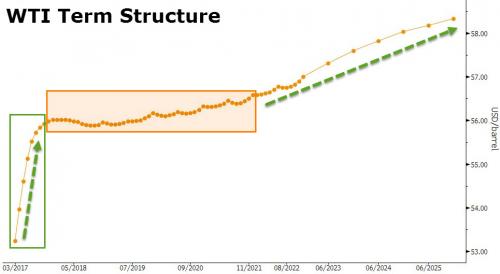 Co jednak dostrzegamy później, przez kolejne kilka lat widać sytuację zwaną backwardation, gdzie ceny terminowe są niższe od spot. Może to być efektem tego, że rynek nie jest do końca przekonany, że deal OPEC będzie niósł daleko idące skutki dla ceny ropy. Wobec tego zaczyna się przewidywać, iż nadpodaż może ponownie się zwiększać, także z racji rosnącej produkcji w USA, co wywierać powinno spadkową presję na ceny.