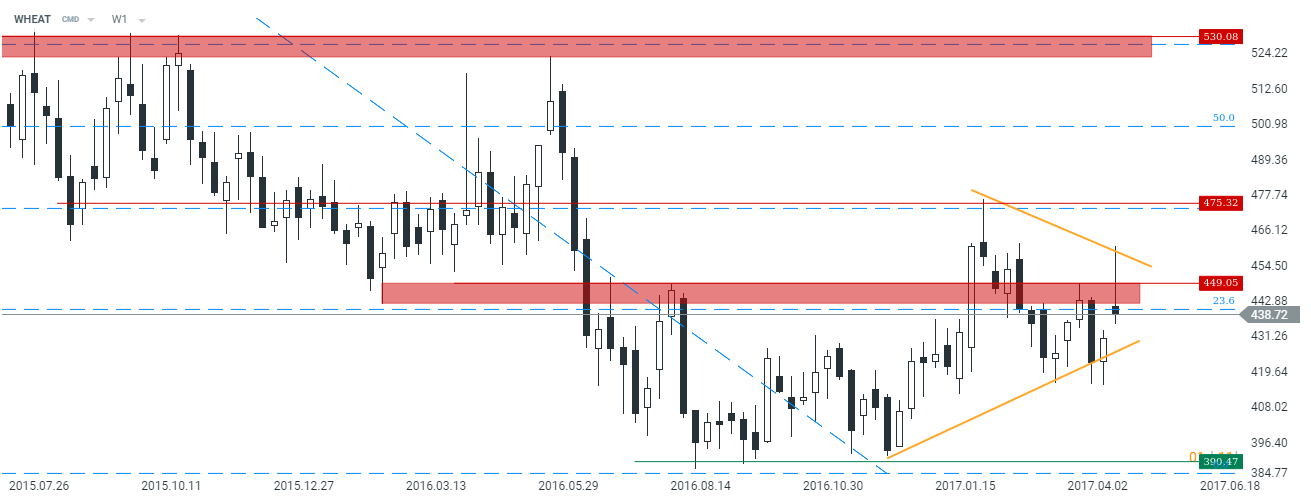 Technicznie notowania kontraktów na pszenicę wciąż przebywają w konsolidacji w ramach formacji trójkąta na interwale tygodniowym. Wszytko wskazuje na to, że wzrosty, jakie notowaliśmy na początku tygodnie nie zdołają się utrzymać, negując przełamanie strefy podażowej.