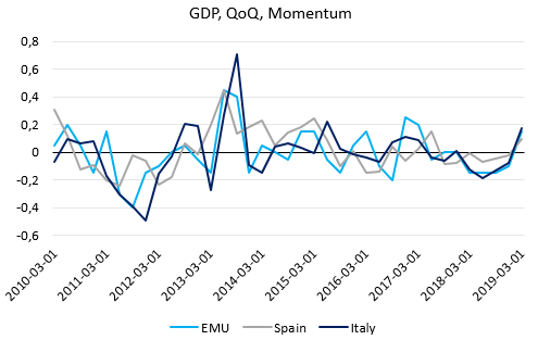 Dzisiejszą analizę zacznijmy od małego podsumowania wstępnych danych odnośnie do dynamiki PKB w krajach strefy euro. W przypadku pogrążonych w problemach Włoch dynamika wzrostu w ujęciu kwartalnym zaskoczyła chyba najbardziej wskazując na ekspansję rzędu 0,2% po dwóch kwartałach technicznej recesji. O ile w tym przypadku możemy mówić o pewnego rodzaju efekcie niższej bazy, o tyle takowej nie było już w Hiszpanii, gdzie kwartalna dynamika wzrostu PKB przyspieszyła do 0,7% z 0,6%. Była to również najwyższa dynamika od końca 2017 roku. Pozytywne zaskoczenie nadeszło nie tylko z krajów dawnego bloku PIGS, ale i również skądinąd. Przykładem jest choćby Francja, gdzie kwartalna dynamika PKB pozostała na poziomie 0,3% już trzeci kwartał z rzędu. Takie wyniki musiały przełożyć się także na solidny wynik na poziomie całej strefy euro. Tak się stało, wstępny odczyt wskazał na 0,4%-owy wzrost, wobec 0,2% w czwartym kwartale minionego roku. Względnie niski punkt startowy i mocna poprawa aktywności gospodarczej na poziomie danych o PKB sprawiła, że tzw. momentum wzrostu gospodarczego uległo znacznemu przyspieszeniu (wskaźnik liczony jako różnica średniej z dwóch ostatnich kwartałów). Czy tak wygląda załamanie koniunktury? Absolutnie nie, a dane dotyczące produkcji przemysłowej mogły po prostu nieco przereagować. Inną kwestią jest to, że choć przemysł w Europie na przełomie roku radził sobie słabo, to sektor usług prosperował bardzo dobrze, dopiero kwiecień przyniósł wyraźniejsze osłabienie wskaźników PMI dla tego sektora. Pewną niewiadomą pozostaje jeszcze struktura wzrostu w pierwszym kwartale, która nomen omen rozczarowała w przypadku USA.