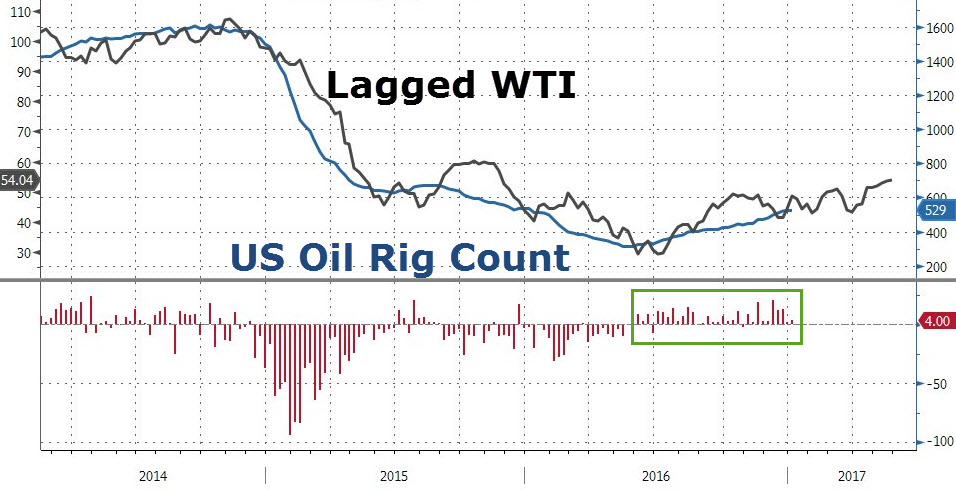 Cena ropy WTI oraz ilość aktywnych wież w USA, źródło: Bloomberg, zerohedge