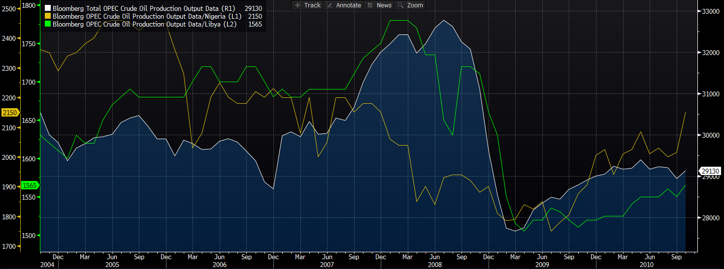 Produkcja ropy w OPEC oraz wyszczególnione wielkości dla Libii oraz Nigerii, źródło: Bloomberg, InsiderFX Research