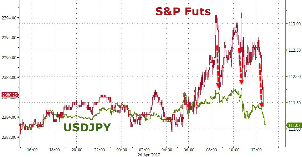 Kontrakty na SP500 i spot USDJPY, źródło: zerohedge, Bloomberg