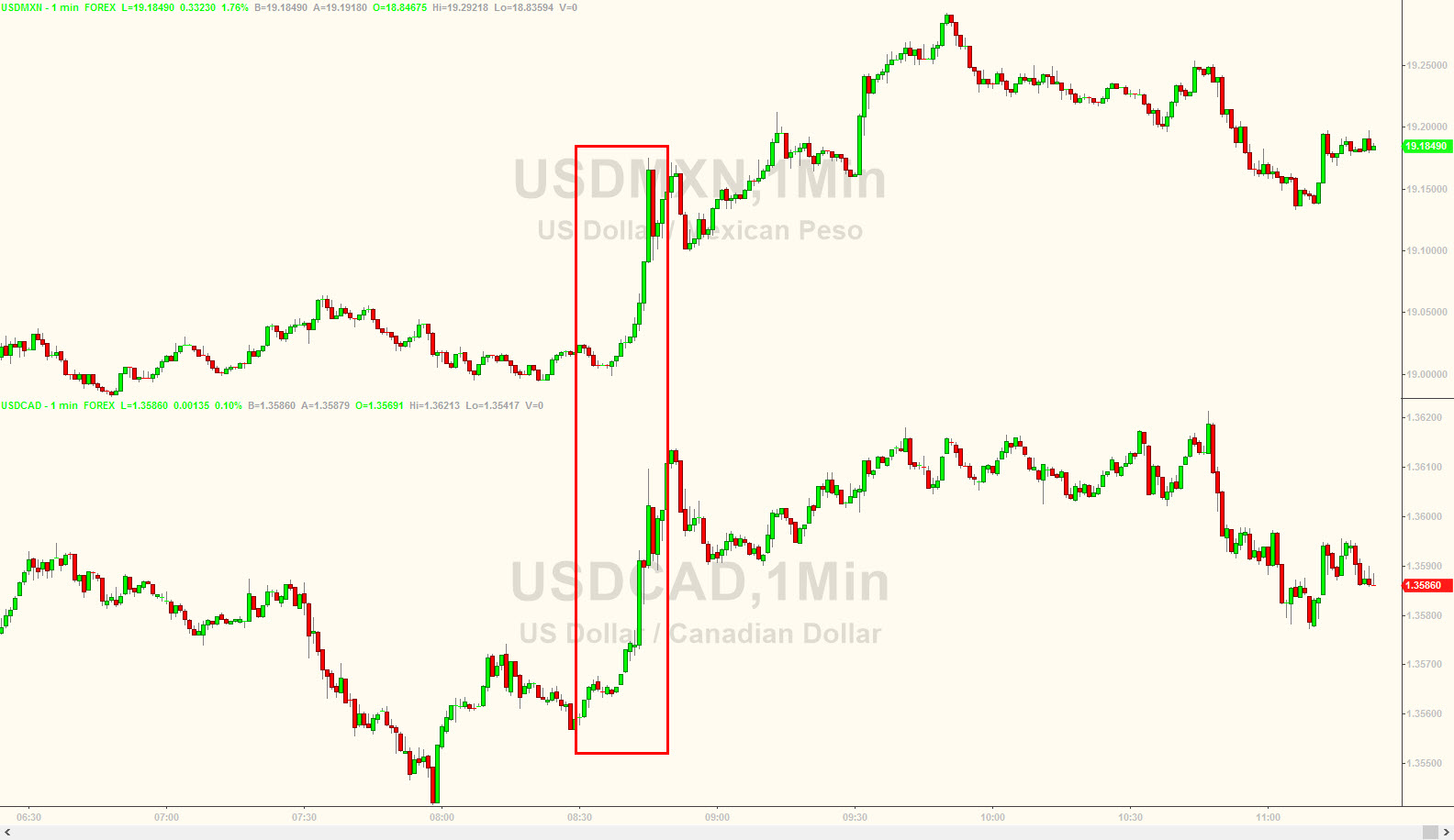 Spot USDMXN i USDCAD, źródło: zerohedge, Bloomberg