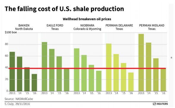 Coś w tym jest. Poza tym należy zwrócić uwagę na bardzo ważny aspekt, który powinie ograniczać zapał entuzjastów wyższych cen surowca. Można by nawet rzec, że porozumienie OPEC będzie prezentem dla producentów ropy z amerykańskich łupków. Ci, od kilku lat systematycznie obniżają wartości progi rentowności produkcji jednej baryłki ropy. Im niższy próg, tym większy bodziec do zwiększania wydobycia przy relatywnie niższej cenie.
