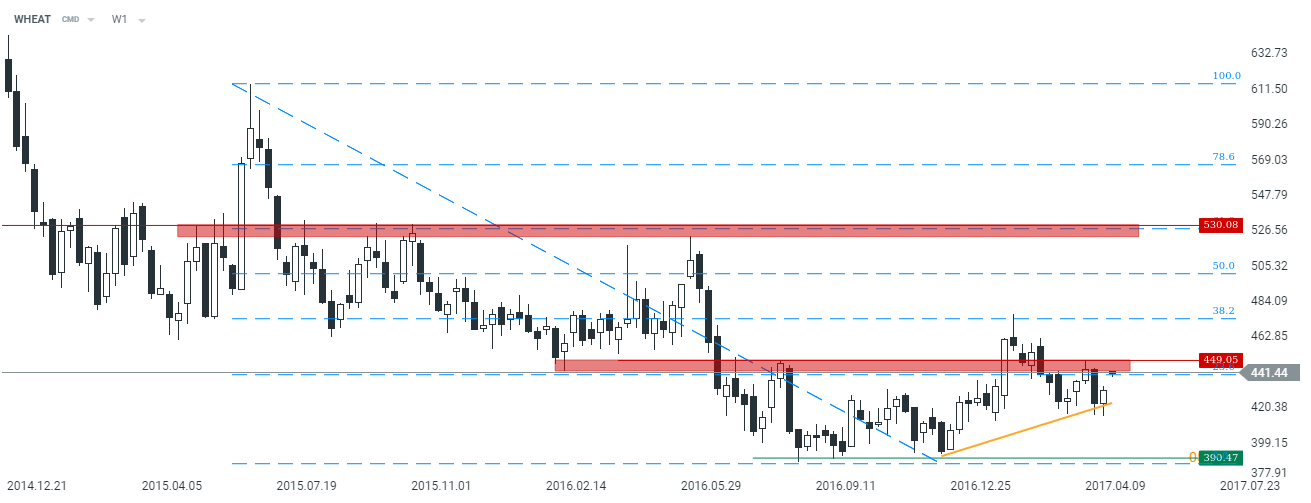 Technicznie w nowym tygodniu możemy podjąć kolejną próbę przełamania strefy oporu w rejonie 450$ za 100 buszli. Zamknięcie się świecy tygodniowe powyżej tego pułapu da szansę na większy atak byków. Z drugiej strony wciąż należy pamiętać o sezonowości, która w chwili obecnej nie jest sprzymierzeńcem pszenicy.