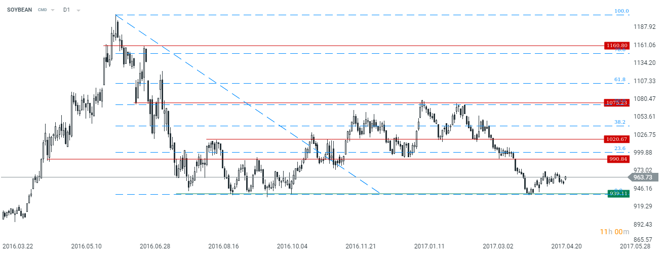 W kwestii technicznej, o ile ceny soi nie powinny znacząco zwyżkować, to ich przecena wydaje się ograniczona do mocnego wsparcia w rejonie 940$ za 100 buszli.