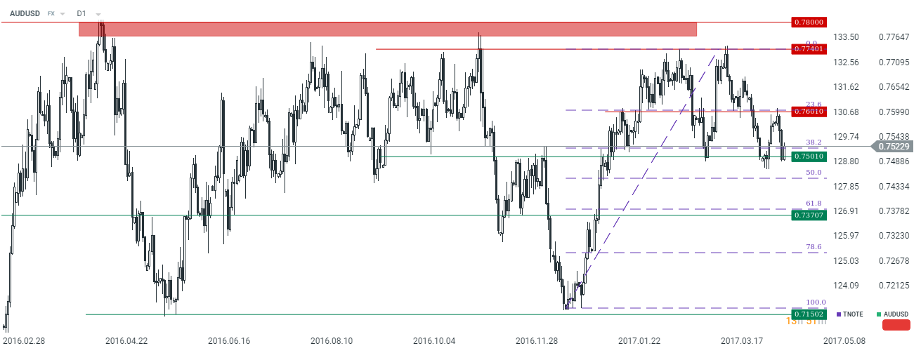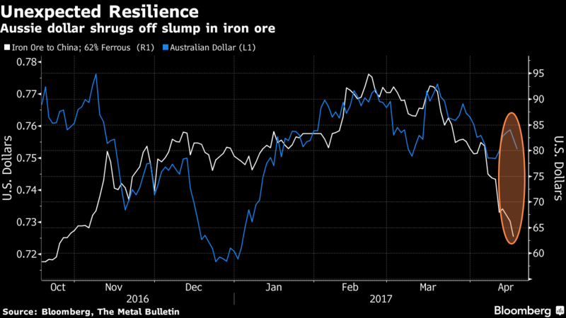 Od momentu, kiedy chiński premier zasygnalizował plany cięcia krajowej zdolności produkcyjnej stali, notowania rudy żelaza spadły 30%. Warto tylko wspomnieć, że eksport australijskiej rudy żelaza stanowi ponad 3% PKB. Niemniej jednak w tym okresie AUD osłabł tylko do pewnego stopnia, zaś ostatnie tąpnięcie w cenach metalu nie wpłynęły mocno na kursu australijskiej waluty.