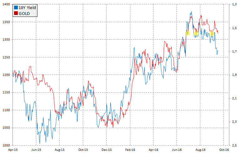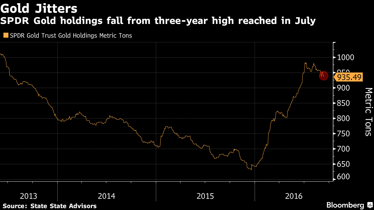 Skąd wynika wycofywanie się inwestorów z rynku złota? Oczywiście rosnące szanse na podwyżkę stóp przez FED. O ile wrześniowe prawdopodobieństwo wynosi obecnie zaledwie 18% (niektórzy sądzą, że jest ono zdecydowanie zaniżone – BNP Paribas), o tyle to samo prawdopodobieństwo na koniec roku wzrosło do 50%. Tym samym inwestorzy postanowili zainkasować zyski.