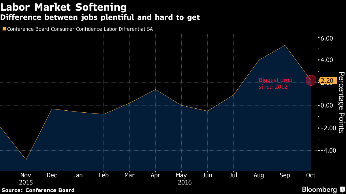 Wczoraj z kolei otrzymaliśmy słabsze dane dotyczące nastrojów konsumentów. Był to wskaźnik Conference Board. Warto w tym względzie zwrócić uwagę na to, co dzieje się na wskaźniku obrazującym różnicę między odpowiedziami ankietowanych mówiących, że znalezienie pracy jest proste w stosunku do tych twierdzących, iż znalezienie zatrudnienia jest trudne.