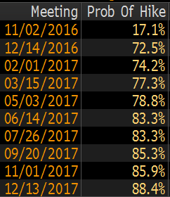 O ile rynek obligacji czy też pieniężny wydają się sceptyczne do takiego podejścia, o tyle rynek walutowy wziął sobie słowa Evansa do serca, wywołując kolejną falę aprecjacji „zielonego”. Warto również dodać, że w zeszłym tygodniu również inny członek Williams zasugerował „kilka” podwyżek jakie mogą się pojawić w przyszłym roku. Tymczasem rynek stopy jest dość pewny jednej podwyżki (grudzień), zaś druga wisi na włosku. W tym momencie należy przypomnieć sobie co FED obiecywał rynkowi w grudniu 2015 (4 podwyżki w tym roku).