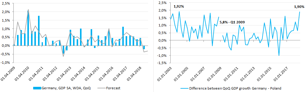 Z punktu widzenia polskiej gospodarki nie będzie to pozytywna informacja. Historycznie rzecz ujmując koniunktura gospodarcza w Polsce reagowała z pewnym opóźnieniem na to, co dzieje się za zachodnią granicą. Tym razem może być podobnie. Gdy Niemcy zwolniły do 0,2% w ujęciu kwartalnym w trzecim kwartale 2018, w Polsce dynamika gwałtownie przyspieszyła do 1,7%. Czwarty kwartał w wykonaniu polskiej gospodarki powinien pozostać jednak na względnie solidnym poziomie, choć wyraźniej poniżej 5% w ujęciu rocznym. Dodajmy również, że różnica między kwartalnymi dynamikami wzrostu PKB Niemiec i Polski zwiększyła się w trzecim kwartale 2018 do 1,9 pkt. proc., tj. najwyższy poziom od pierwszego kwartału 2004 roku, nie licząc gwałtownego tąpnięcia niemieckiej gospodarki w pierwszym kwartale 2009. Tym samym w kolejnych dwóch kwartałach prawdopodobny jest powrót do bardziej zrównoważonych pułapów rzędu 0,7 pkt. proc. na korzyść polskiej gospodarki.